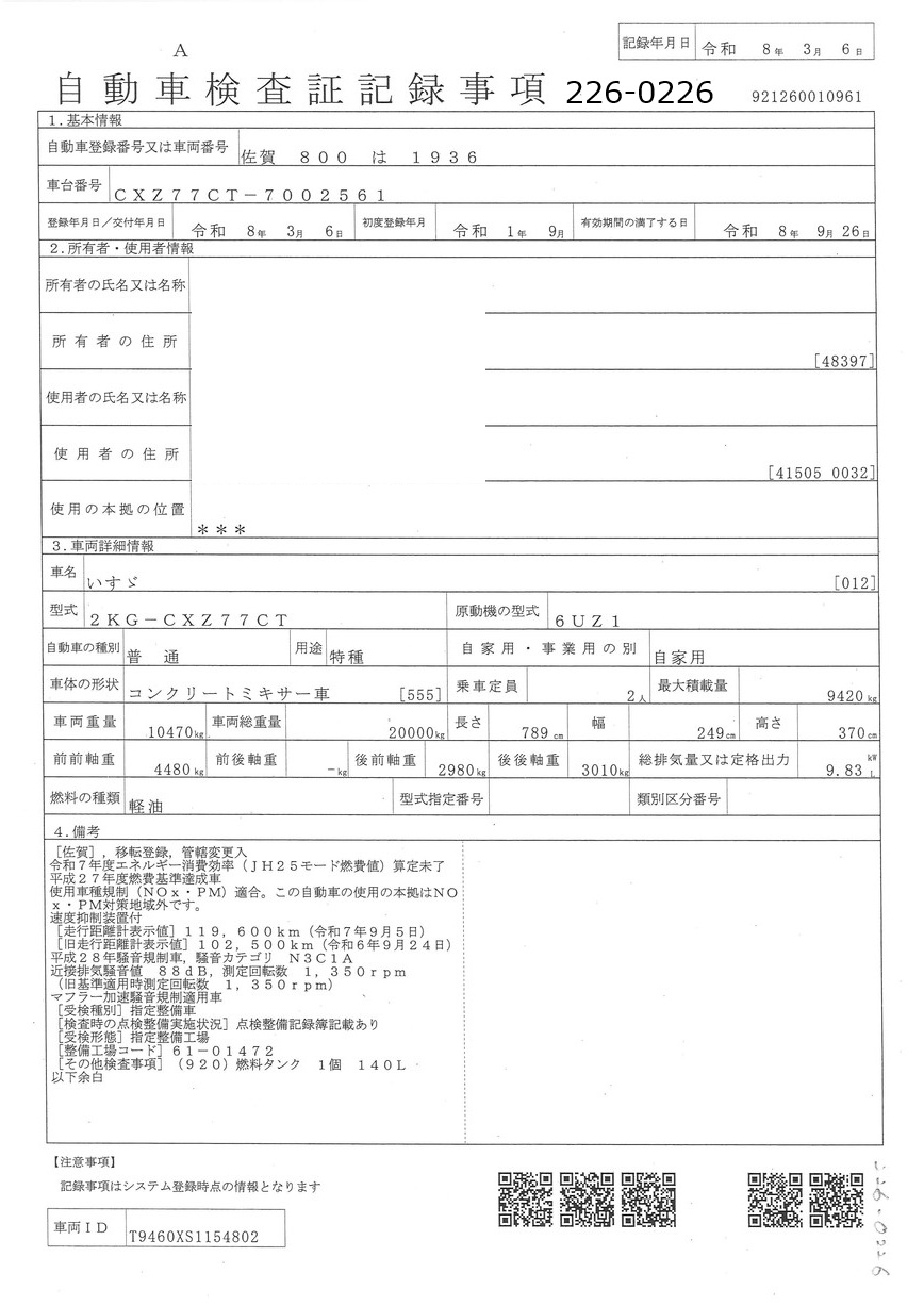 お問い合わせ番号:226-0226R| クラス(車両) | 大型 | メーカー | いすゞ |