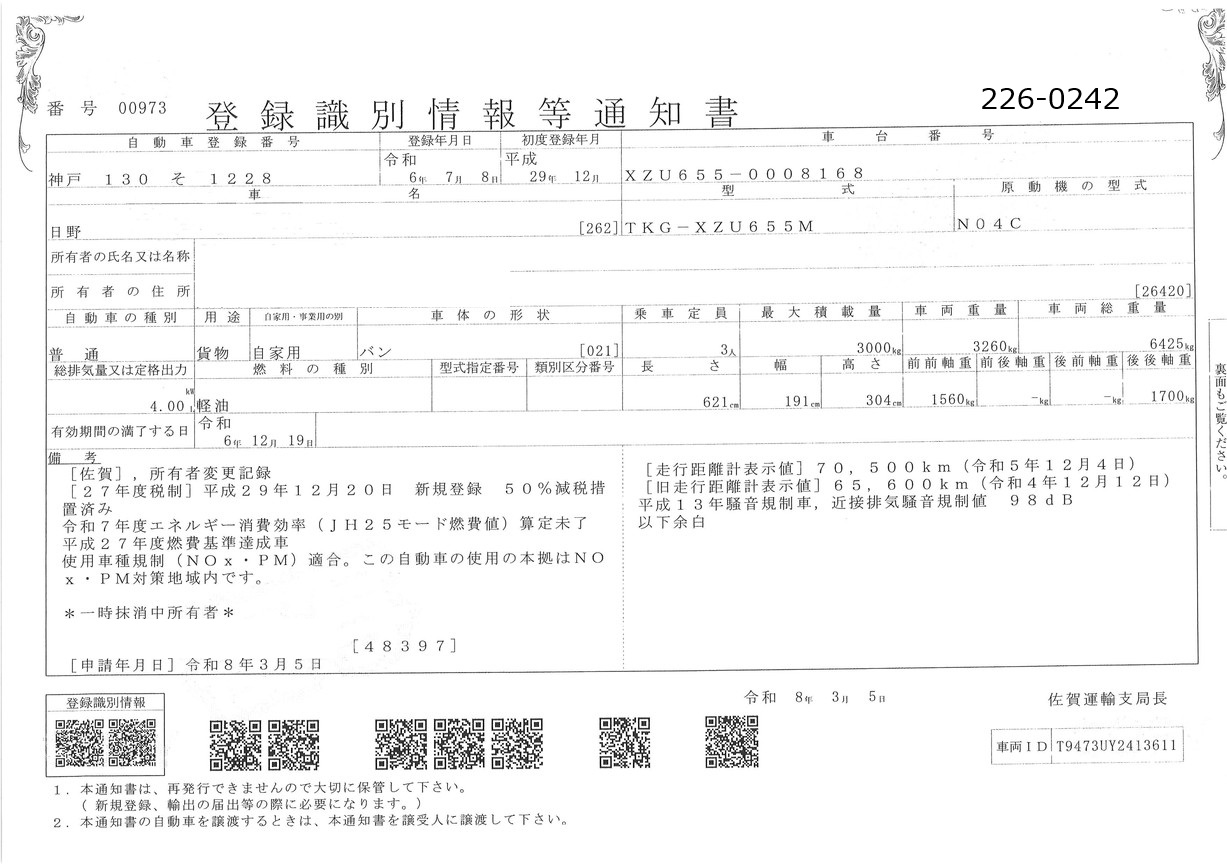 | 備考 | 標準 ロング 鉄縞床 左S/Dスライド アドブル無 ジョロダー2 バックアイカメラ(カラー) ETC 地上高1000 メインキー1 |