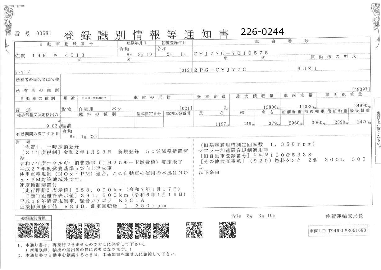 お問い合わせ番号:226-0244R| クラス(車両) | 大型 | メーカー | いすゞ |
