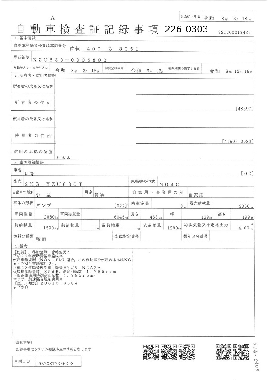 | 車検期限 | R08/12/19 | 走行距離 | 500Km |