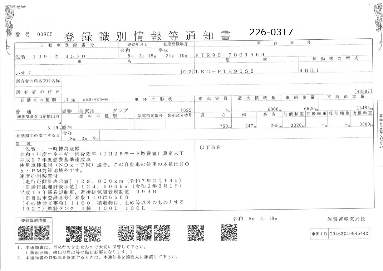 お問い合わせ番号:226-0317R| クラス(車両) | 大型 | メーカー | いすゞ |
