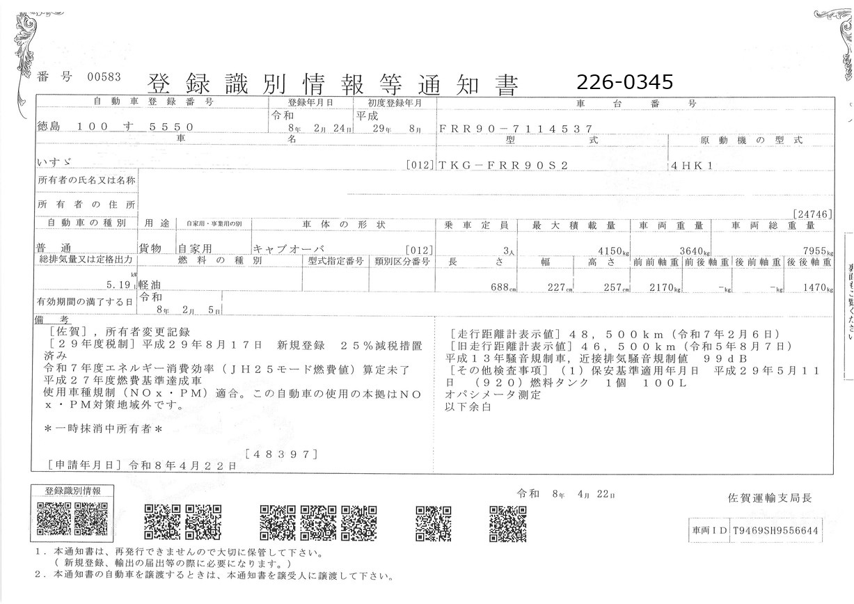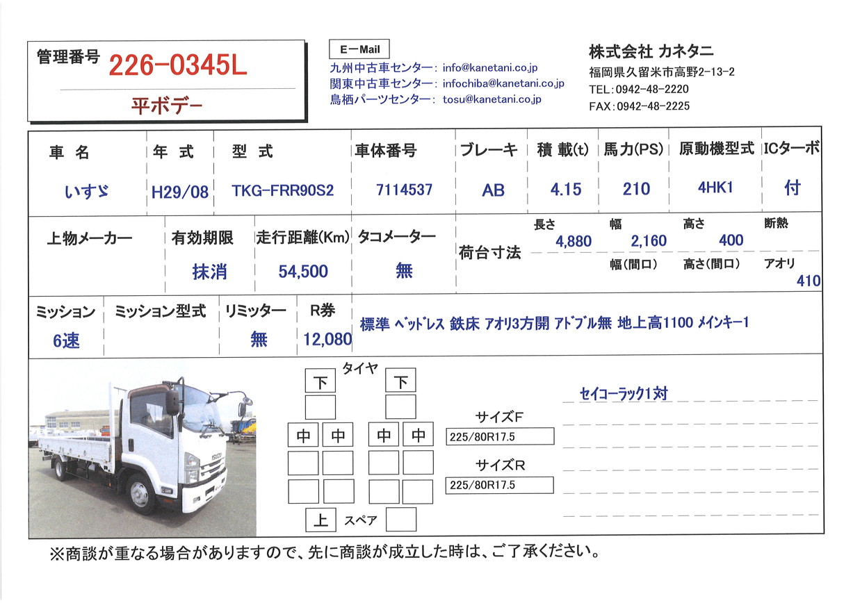 | 車両形式 | TKG-FRR90S2 | エンジン馬力 | 210PS |
