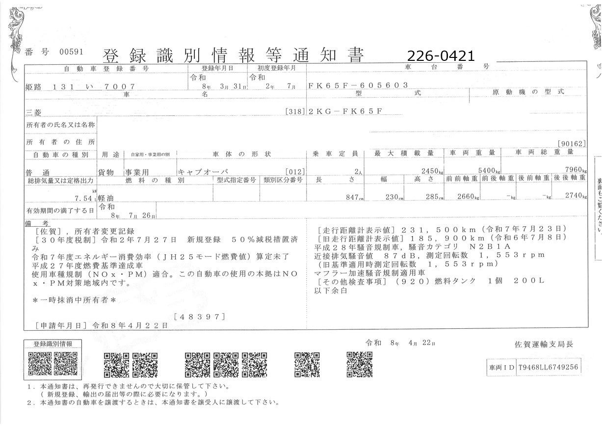 お問い合わせ番号:226-0421R| クラス(車両) | 中型 | メーカー | 三菱 |