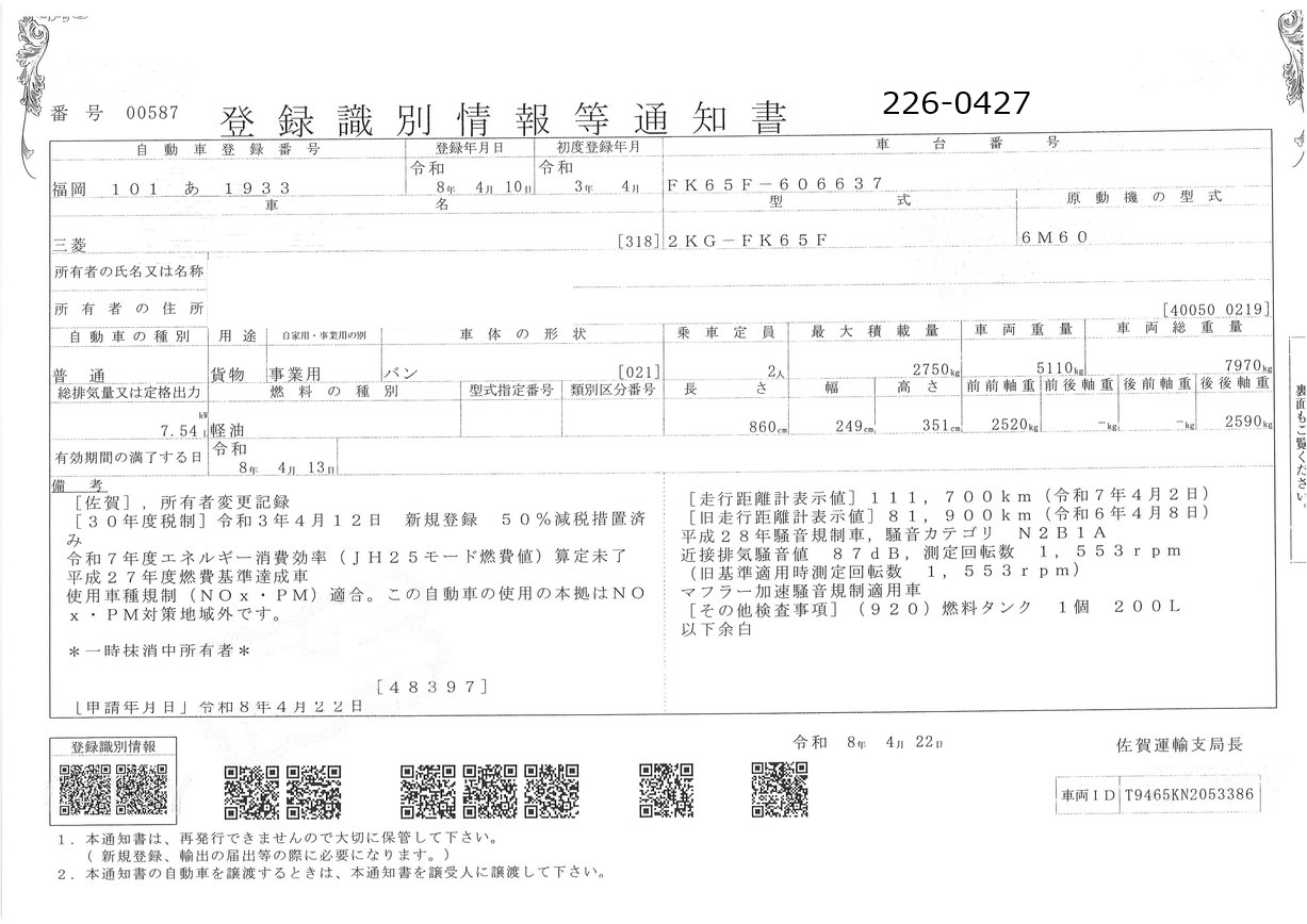 お問い合わせ番号:226-0427C| クラス(車両) | 中型 | メーカー | 三菱 |