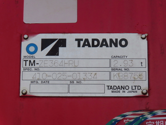| 備考 | ワイド ベッド 鉄床(二重貼) アオリ3方開 アドブル無 タダノ TM-ZE364HRU 4段ラジコンフックイン(吊上2.93t) 差違 ETC 地上高1090 メインキー1 記録簿H29-R2、R4-6 |