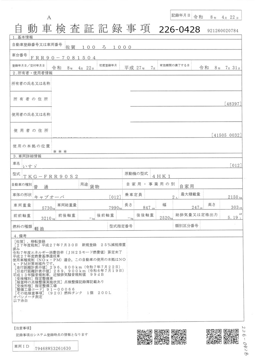 | 車両形式 | TKG-FRR90S2 | エンジン馬力 | 240PS |