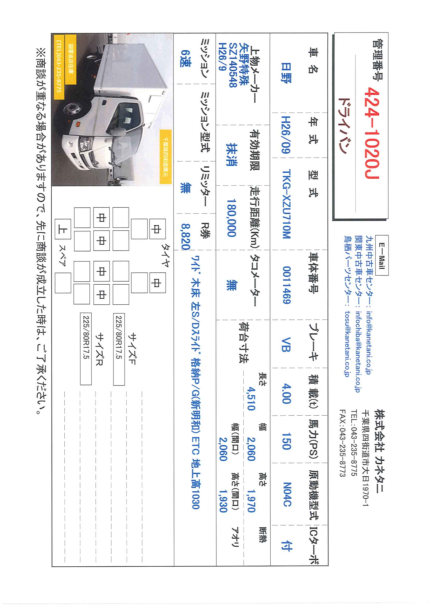 備考 | ワイド 木床 左S/Dスライド 格納P/G(新明和) ETC 地上高1030 P/G後付(要構変) 推定積載3.7t スペアキー無 |