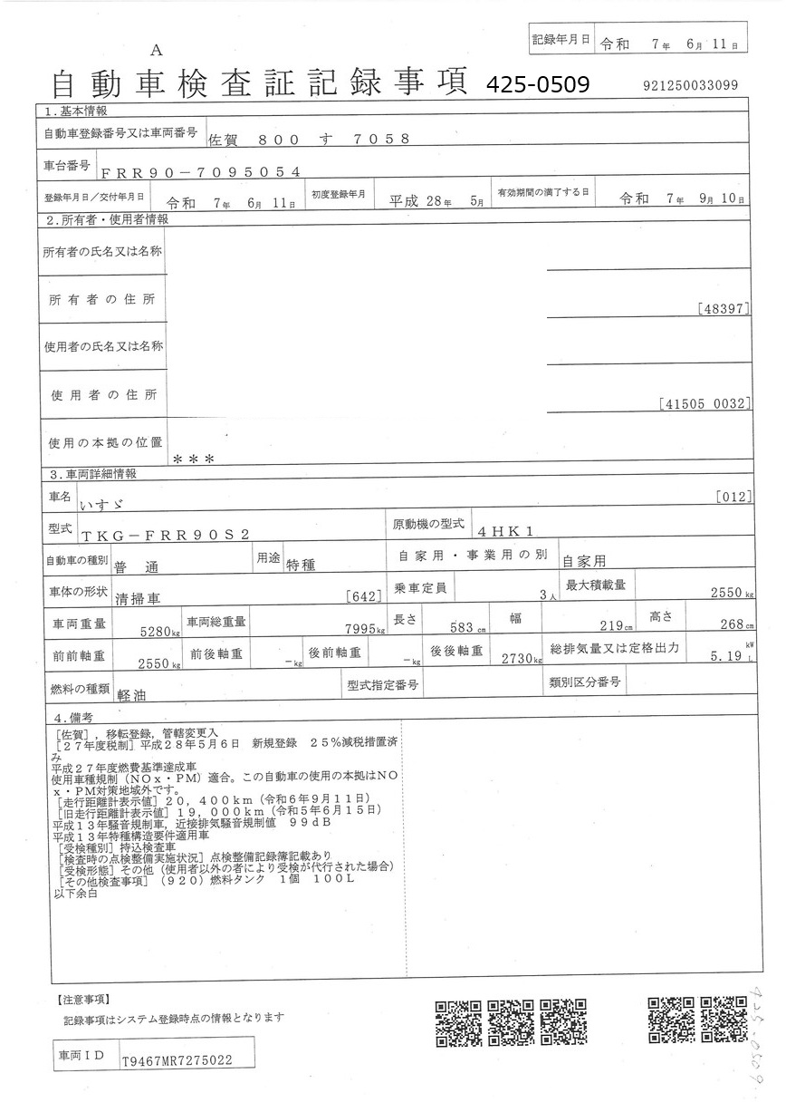 | 車両形式 | TKG-FRR90S2 | エンジン馬力 | 210PS |