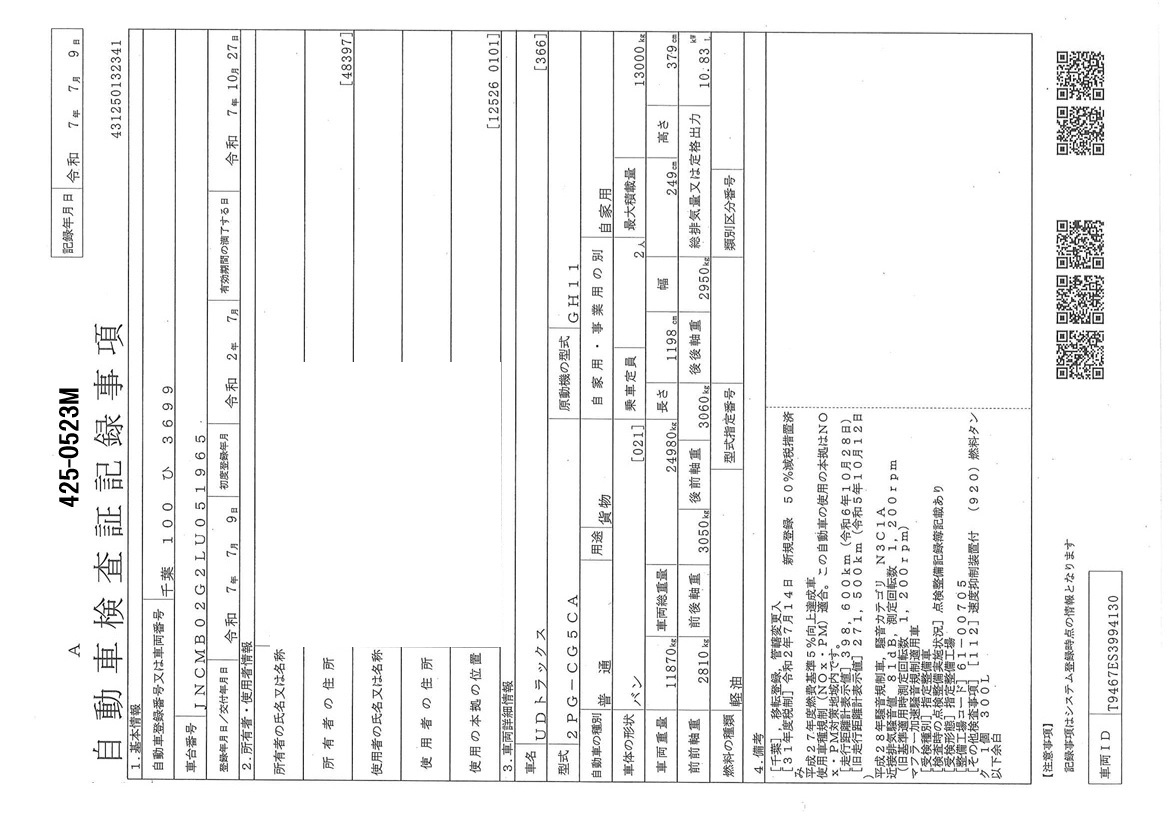 お問い合わせ番号:425-0523M| クラス(車両) | 大型 | メーカー | 日産 |
