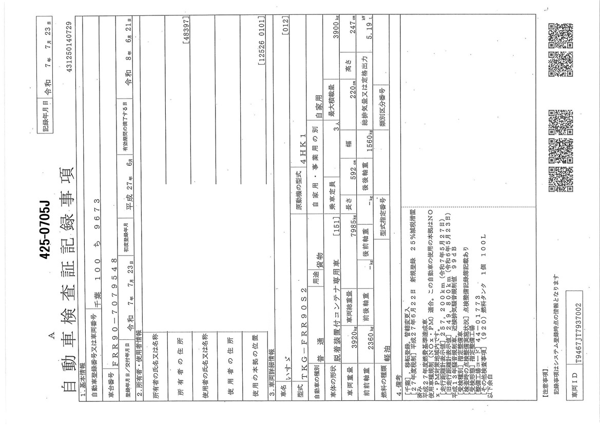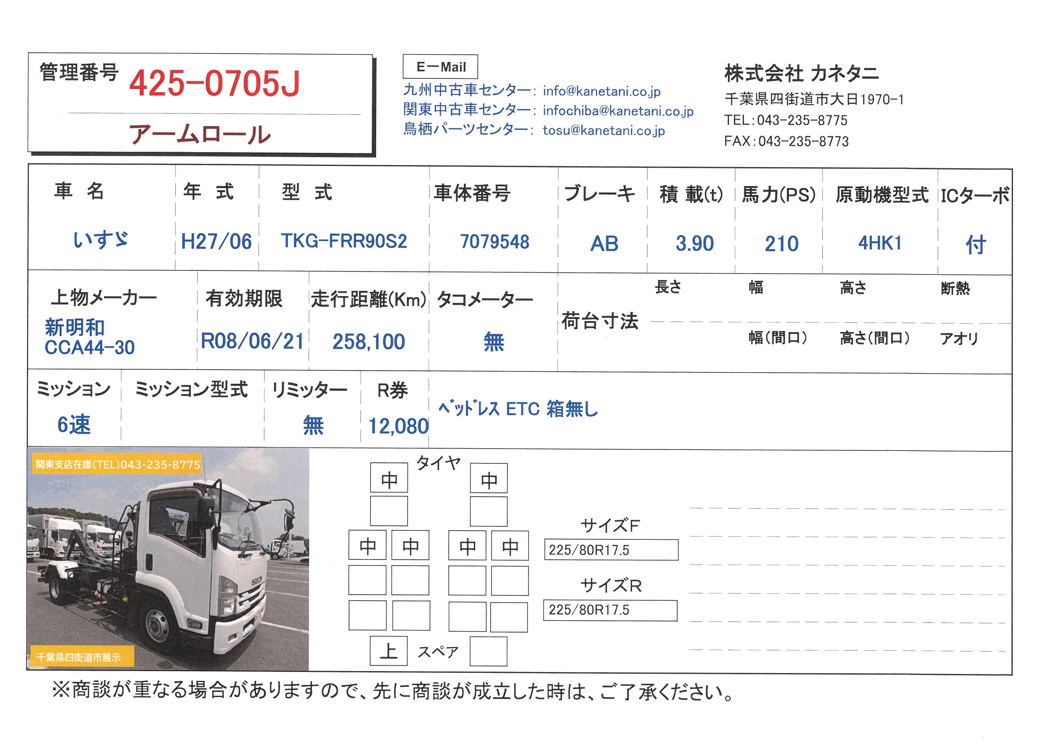車両形式 | TKG-FRR90S2 | エンジン馬力 | 210PS |