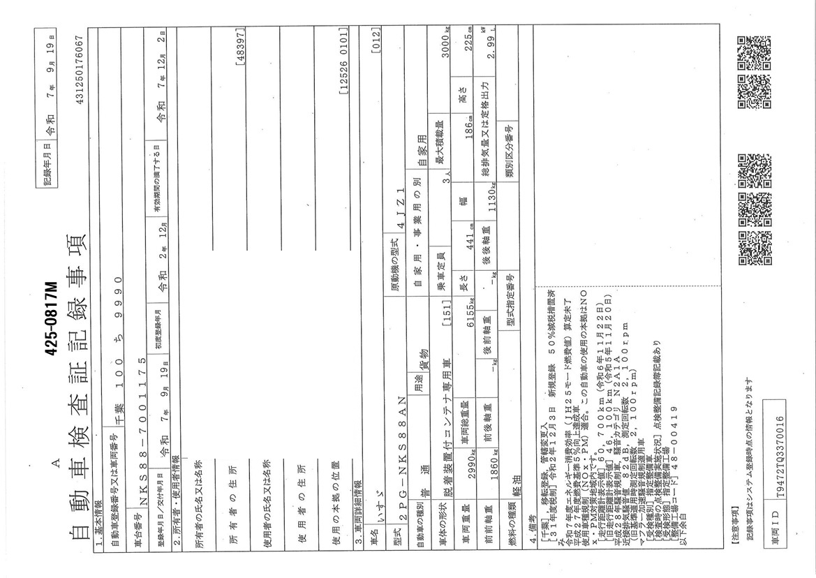 車両形式 | 2PG-NKS88AN | エンジン馬力 | 150PS |