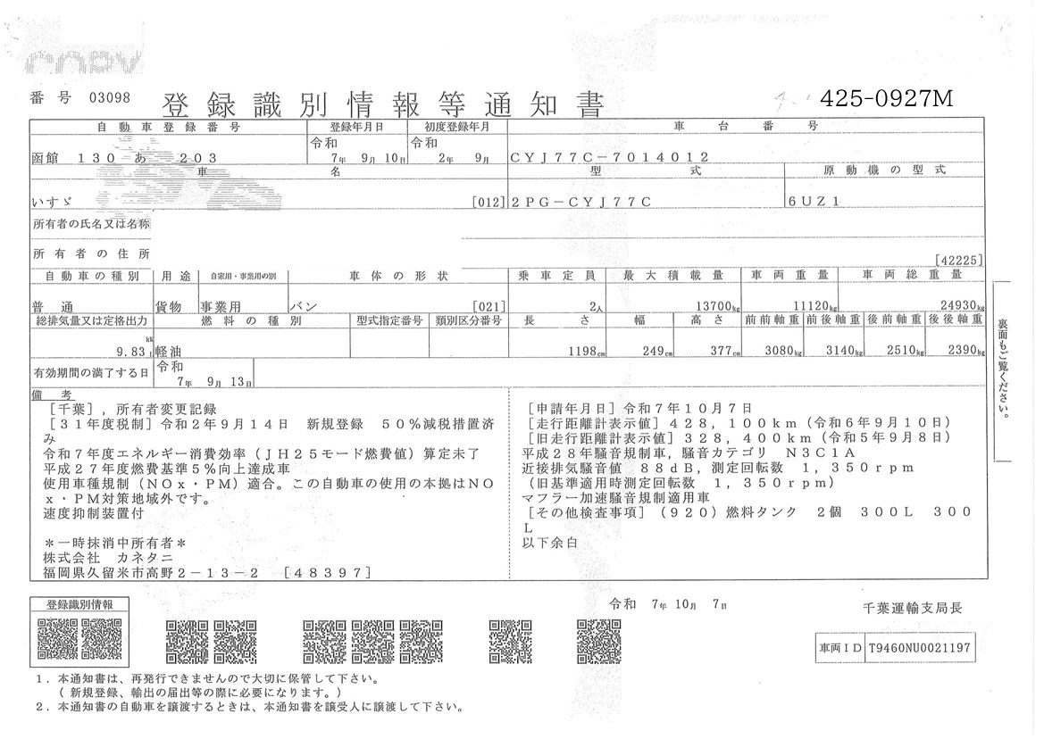 車両形式 | 2PG-CYJ77C | エンジン馬力 | 0PS |