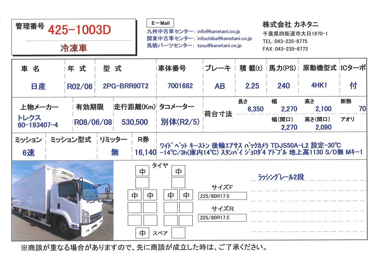 | 備考 | ワイド ベット キーストン 後輪エアサス バックカメラ TDJS50A-L2 設定-30℃ -14℃/3h(庫内14℃) スタンバイ ジョロダ4 アドブル 地上高1130 S/D無 Mキー1 Sキー1 |