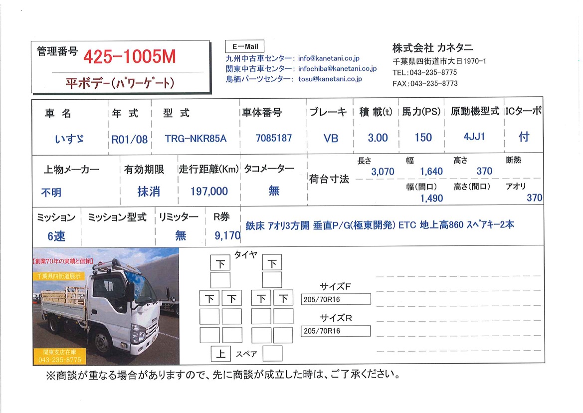 | 備考 | 鉄床 アオリ3方開 垂直P/G(極東開発) ETC 地上高860 スペアキー2本 記録簿R1-R7 |