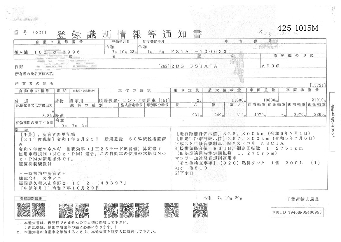| 積載量 | 11000Kg | 長(L) | 5860mm |