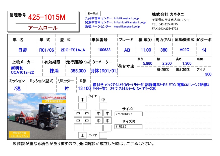 | 備考 | 箱付き バックアイカメラ(カラー) リターダ 記録簿R2-R5 ETC 電動コボレーン(配線コネクター有) 2デフ アルミホイール スペアキー2本 |