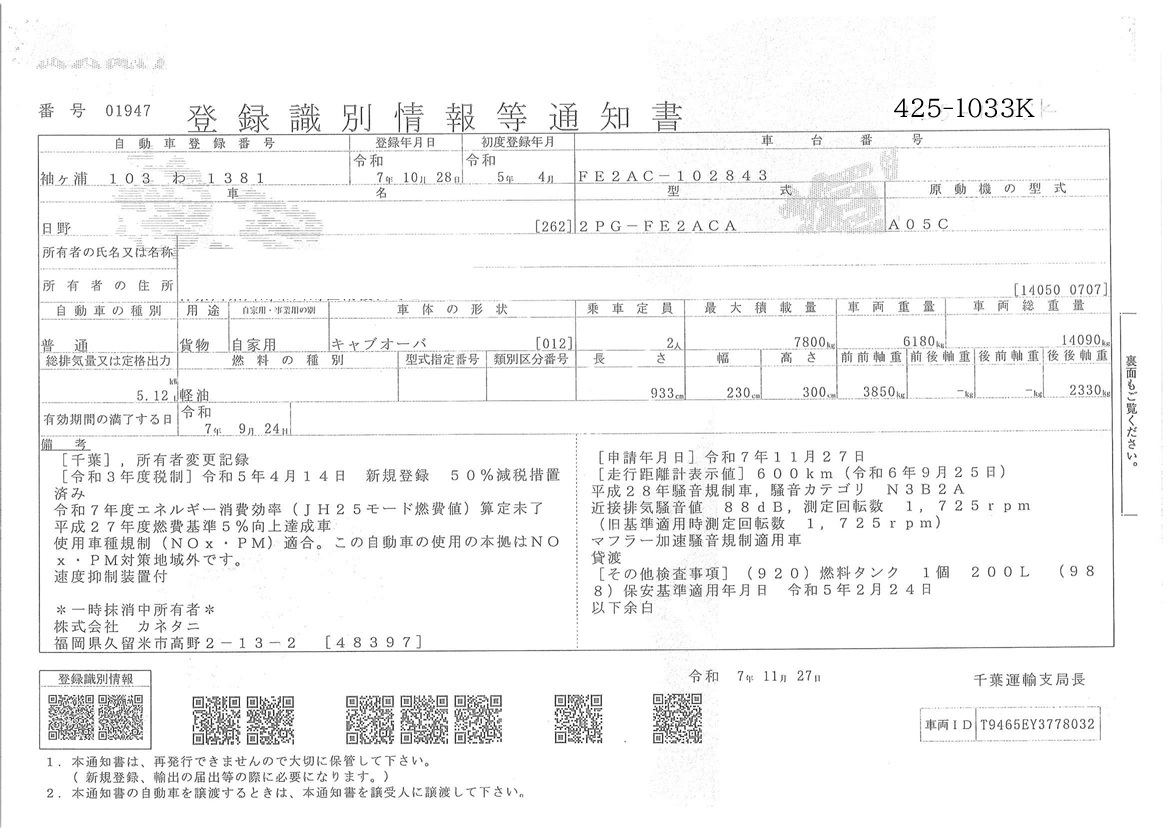 | 備考 | 木床 アオリ3方開 ETC 4段ラジコンフックイン(吊上2.93t) 地上高1130 スペアキー無 記録簿R6-R7 |