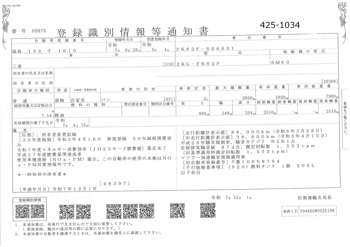 お問い合わせ番号:425-1034K| クラス(車両) | 中型 | メーカー | 三菱 |