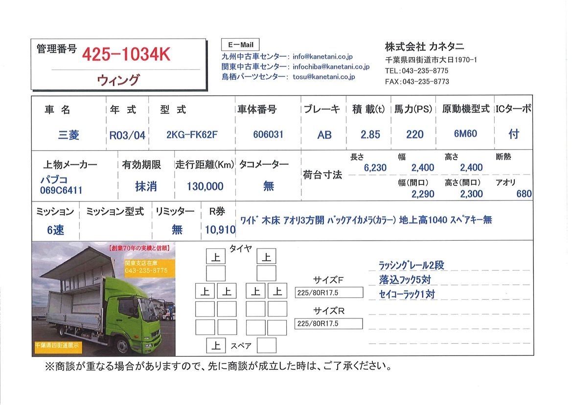 | 備考 | ワイド 木床 アオリ3方開 バックアイカメラ(カラー) 地上高1040 スペアキー無 |