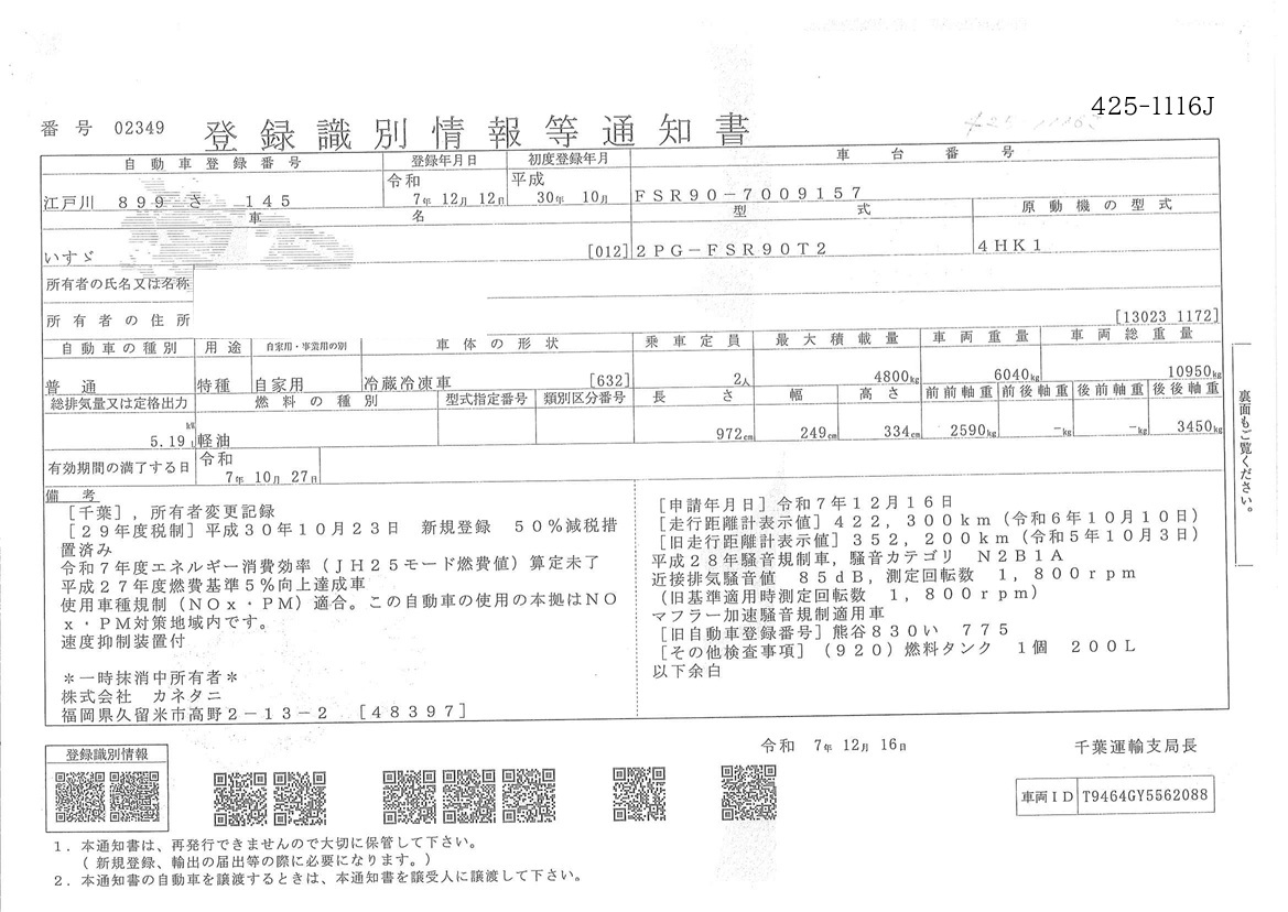 | 備考 | ワイド ベッド アルミ縞床 後輪エアサス バックアイカメラ(カラー) 格納P/G(新明和) 冷凍機XV72L -21.5℃/3h(庫内温度7.5℃) アルミホイール 地上高1130 スペアキー2本 |