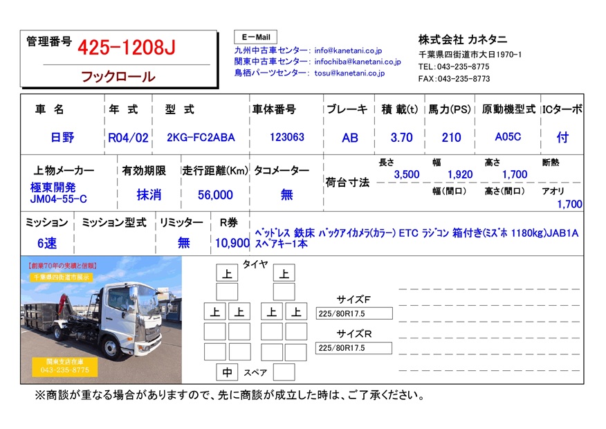 | 備考 | ベッドレス 鉄床 バックアイカメラ(カラー) ETC ラジコン 箱付き(ミズホ 1180㎏)JAB1A スペアキー1本 |