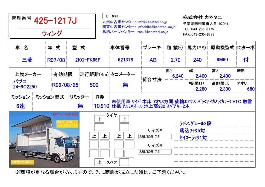 | 備考 | 未使用車 ワイド 木床 アオリ3方開 後輪エアサス バックアイカメラ(カラー) ETC 融雪仕様 アルミホイール 地上高980 スペアキー2本 |