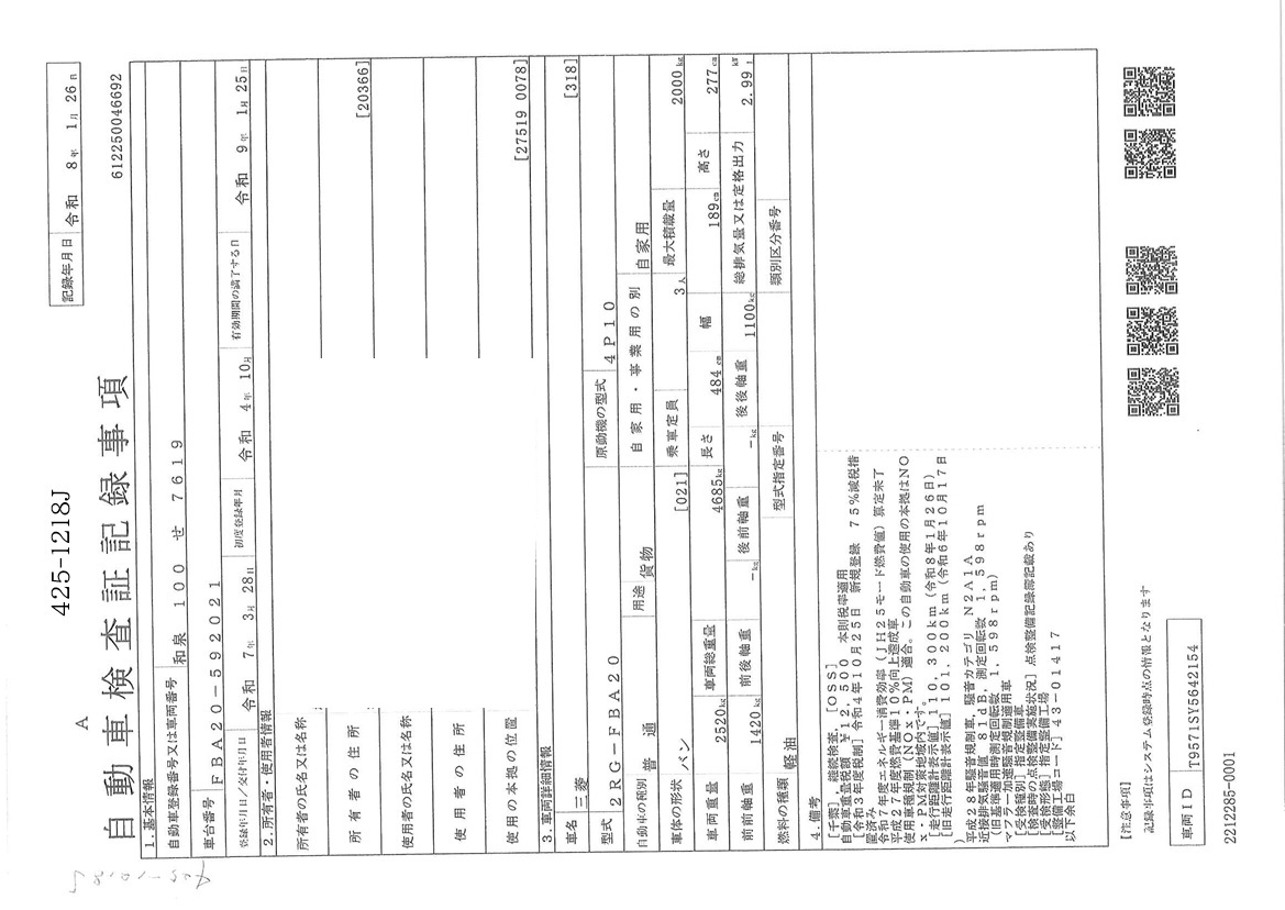 | 車検期限 | R09/01/25 | 走行距離 | 111,000Km |