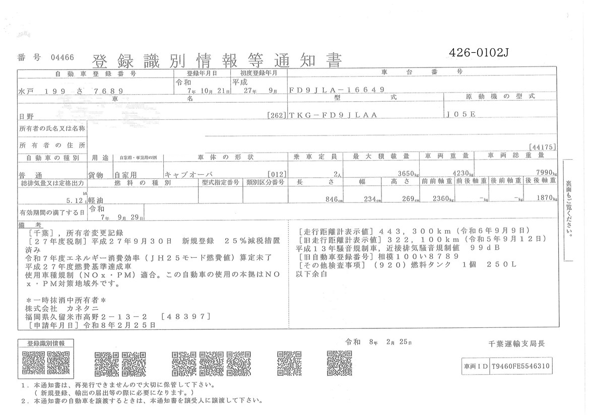 | 車検期限 | 抹消 | 走行距離 | 561,000Km |