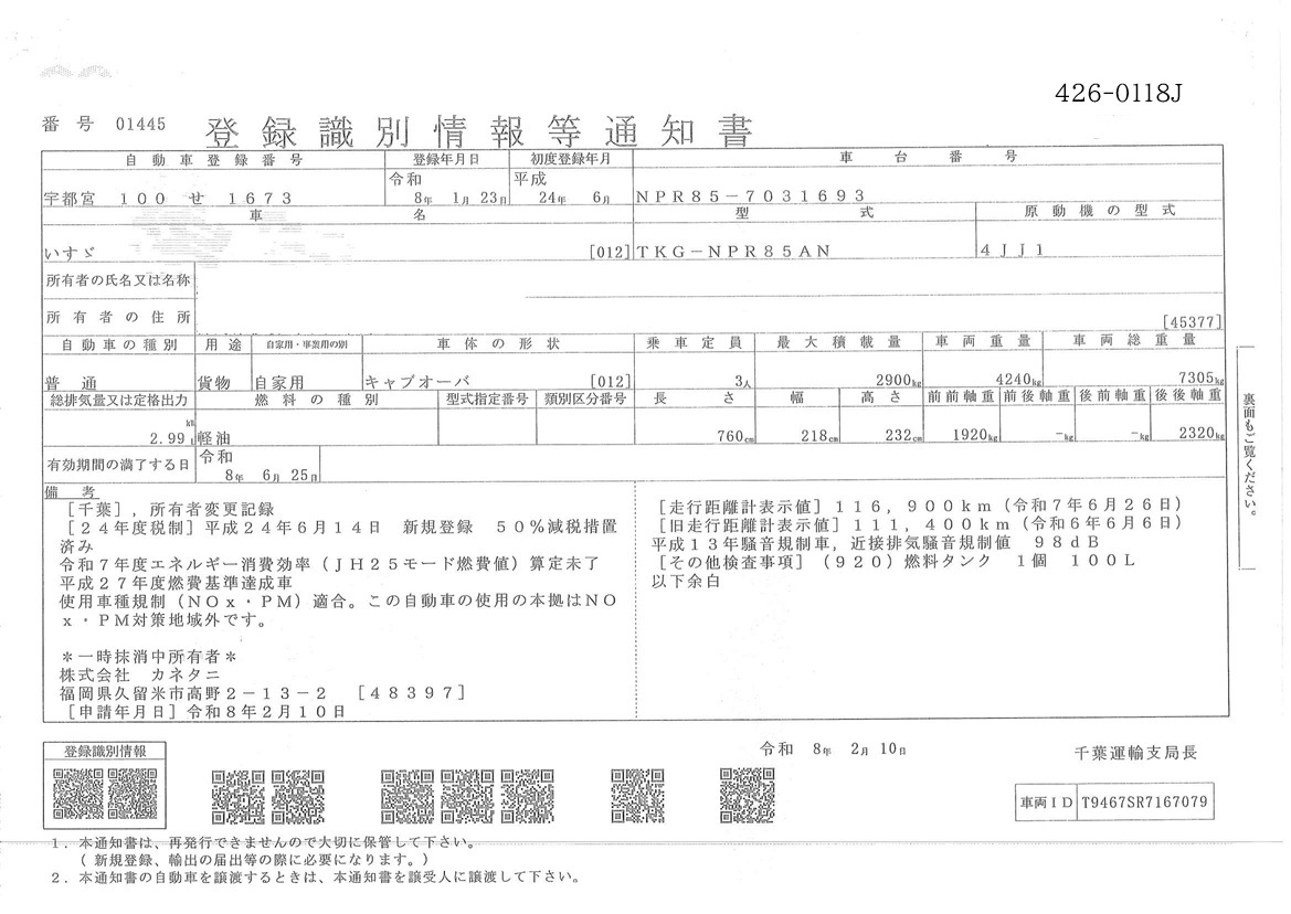 | 車両形式 | TKG-NPR85AN | エンジン馬力 | 150PS |