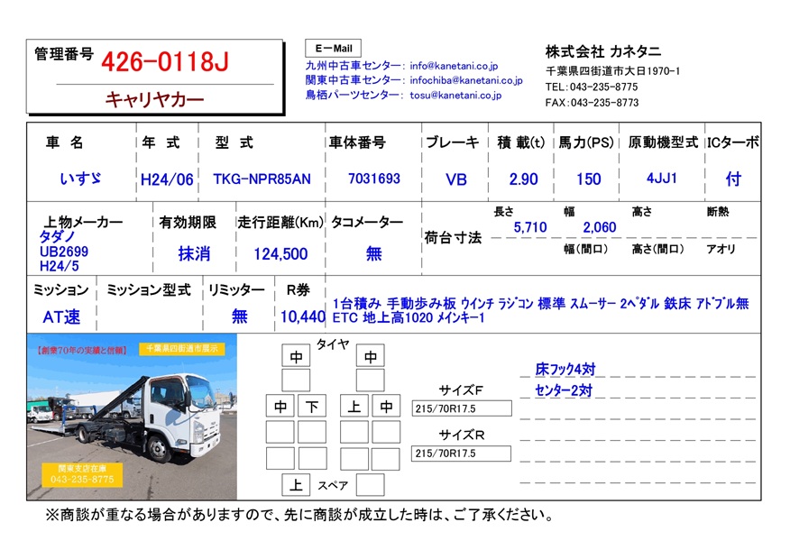 | 備考 | 1台積み 手動歩み板 ウインチ ラジコン スムーサー 2ペダル ワイド 鉄床 アドブル無 ETC 地上高1020 メインキー1 |
