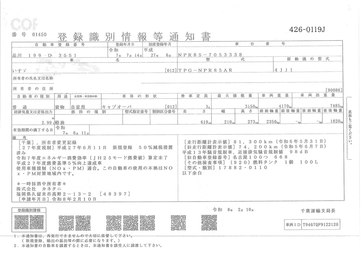| 車両形式 | TPG-NPR85AR | エンジン馬力 | 150PS |