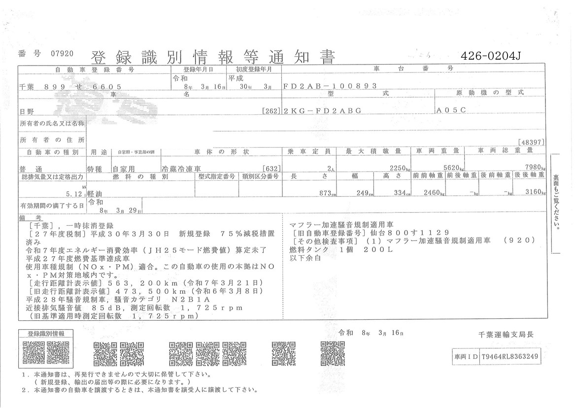 | 備考 | ワイド キーストン 後輪エアサス バックアイカメラ(カラー) 左S/D観音 ラジコン アドブル 格納P/G(新明和) 冷凍機TDJS50A-L2 直結 -11.5℃/3h(庫内温度13.1℃) |