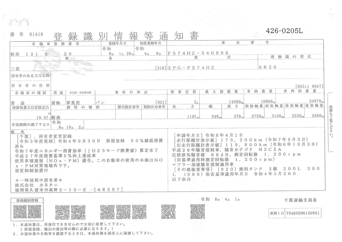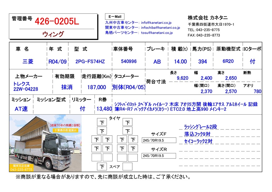 お問い合わせ番号:426-0205L| クラス(車両) | 大型 | メーカー | 三菱 |