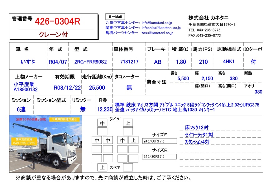 | 備考 | 標準 鉄床 アオリ3方開 アドブル ユニック 5段ラジコンフックイン(吊上2.93t)URG375 差違 バックアイカメラ(カラー) ETC 地上高1080 メインキー1 記録簿R7 |