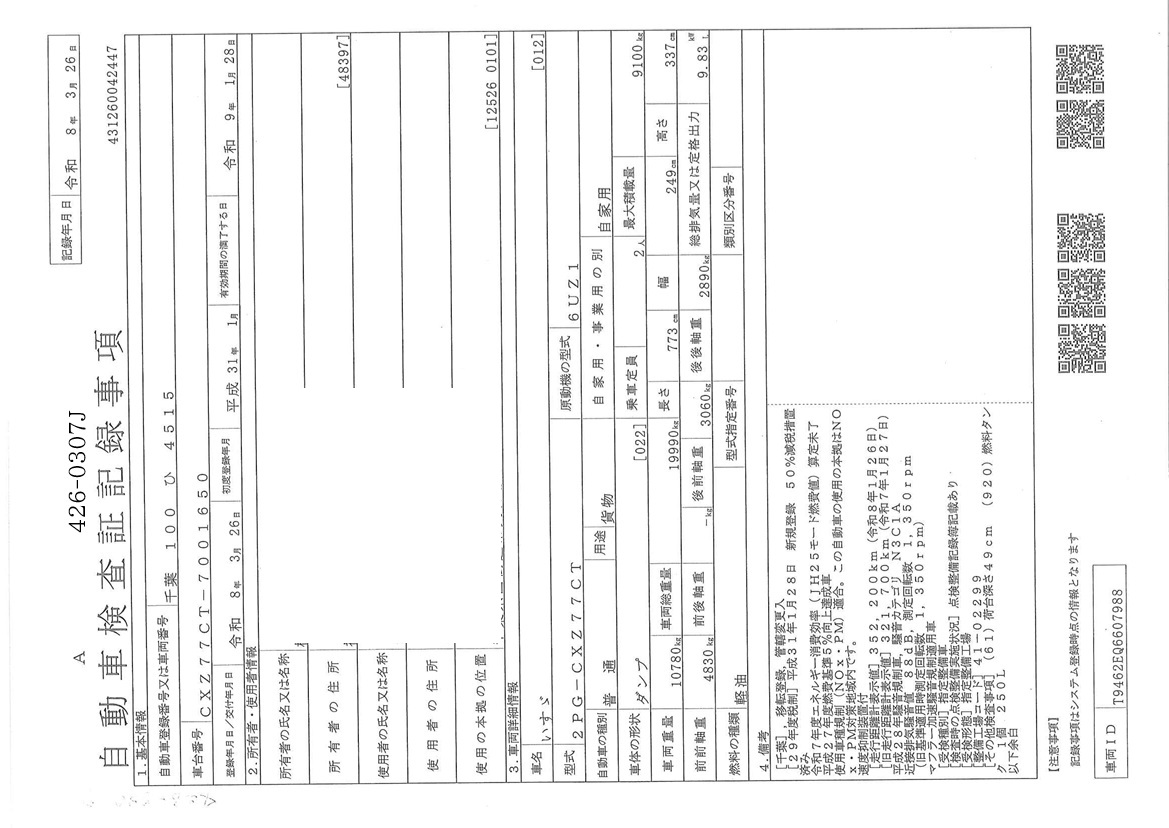 | 車検期限 | R09/01/28 | 走行距離 | 353,000Km |