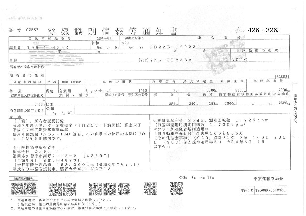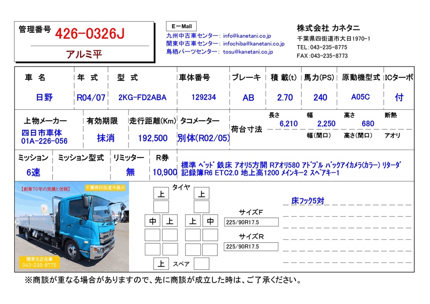 | 備考 | 標準 ベッド 鉄床 アオリ5方開 Rアオリ580 アドブル バックアイカメラ(カラー) リターダ 記録簿R6 ETC2.0 地上高1200 メインキー2 スペアキー1 |
