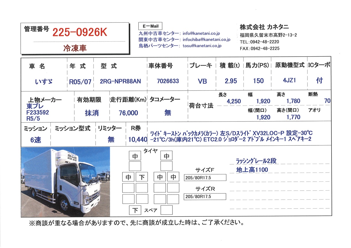 | 備考 | ワイド キーストン バックカメラ(カラー) 左S/Dスライド XV32LOC-P 設定-30℃ -21℃/3h(庫内21℃) ETC2.0 ジョロダー2 アドブル メインキー1 スペアキー2 |