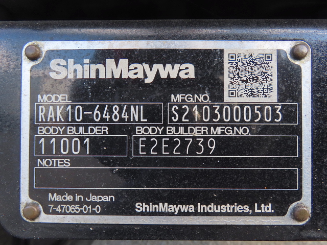 | 備考 | ワイド アルミ縞床 バックアイカメラ(カラー) 左S/D片開 格納P/G(新明和) 冷凍機TDJS35A-L2 -30℃設定-10℃/3h(庫内温度18℃) 地上高1020 アドブル無 Mキー1Sキー1 |