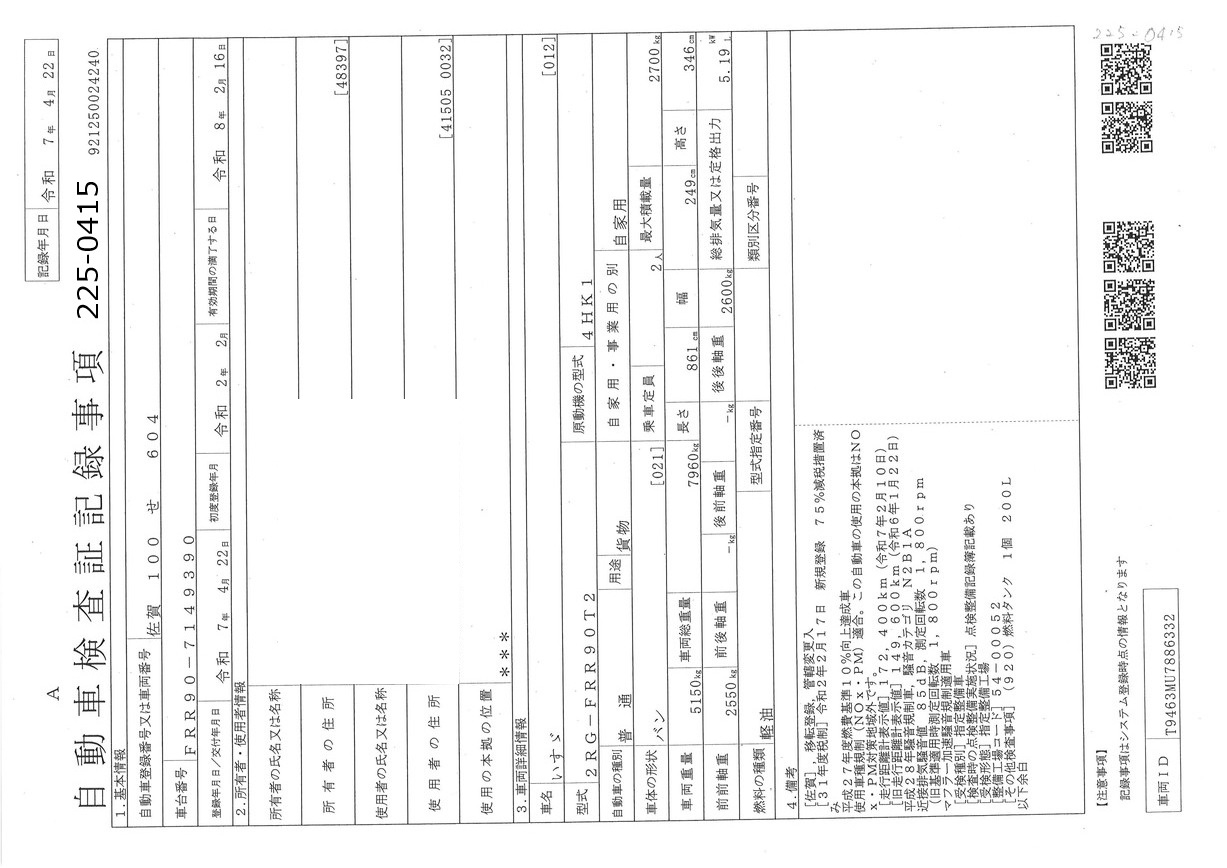 | リサイクル券 | 12460 | タイヤ状態 |