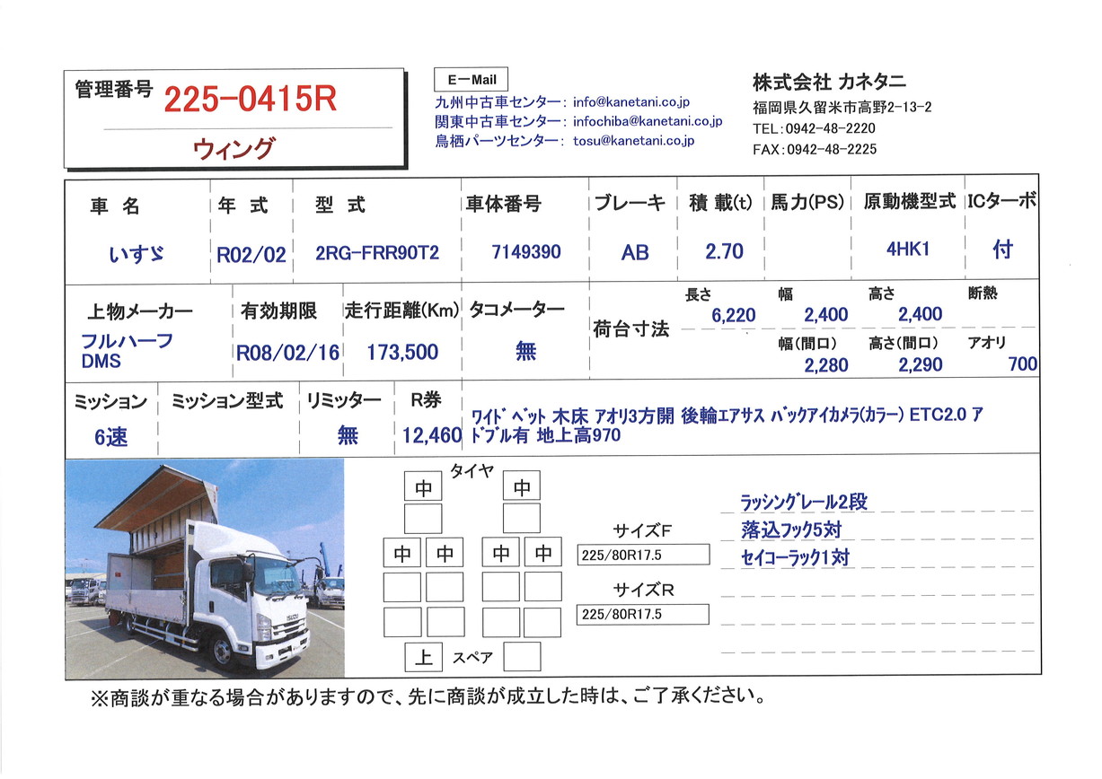 | 備考 | ワイド ベッド 木床 アオリ3方開 後輪エアサス バックアイカメラ(カラー) ETC2.0 アドブル有 地上高970 |