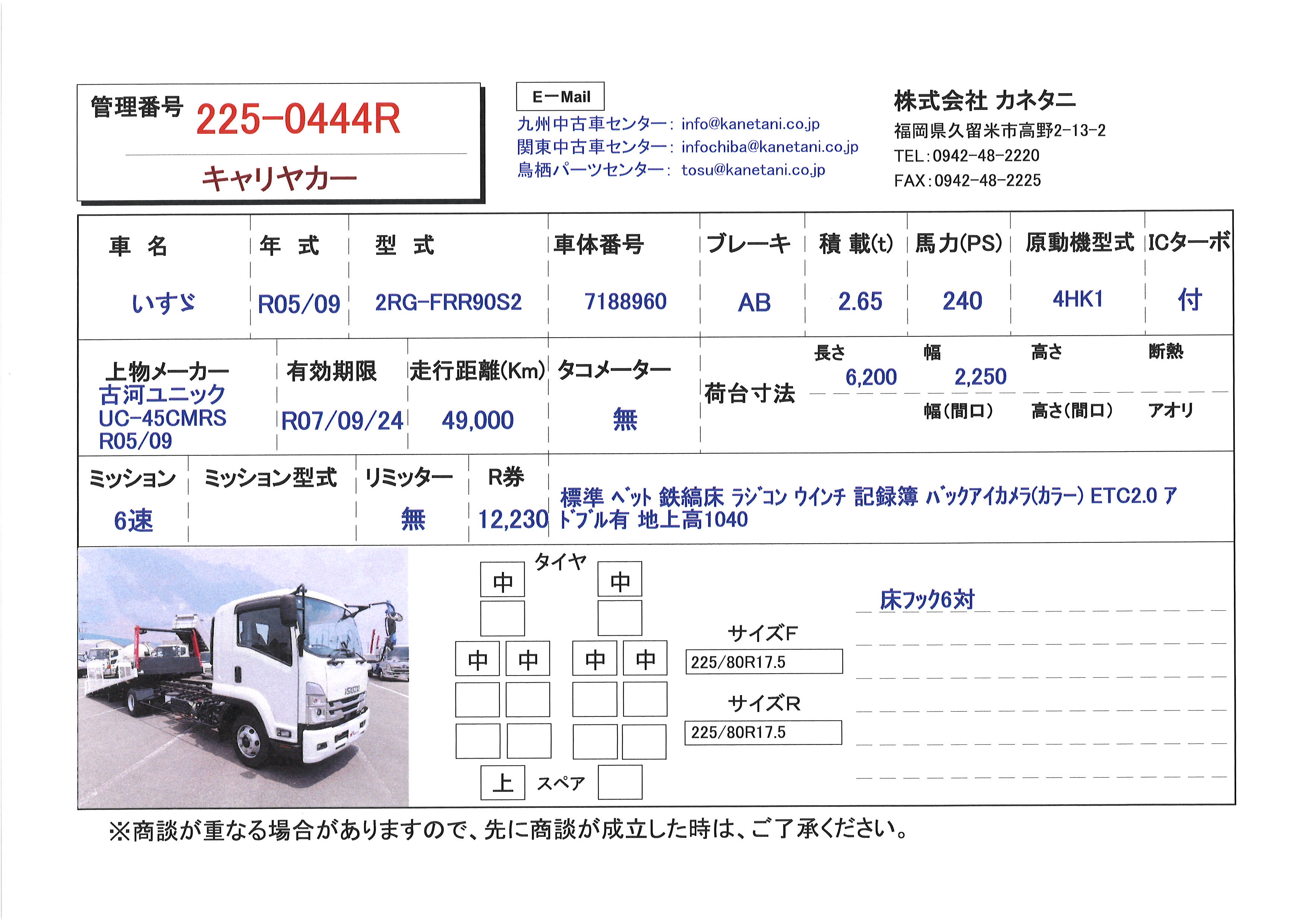 | 備考 | 標準 ベッド 鉄縞床 ラジコン ウインチ 記録簿 バックアイカメラ(カラー) ETC2.0 アドブル有 地上高1040 |