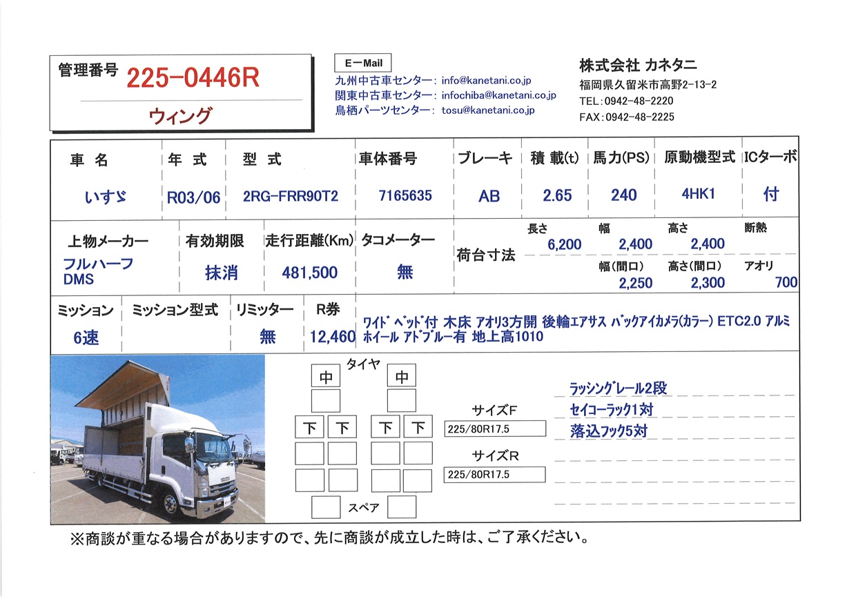 | 備考 | ワイド ベッド付 木床 アオリ3方開 後輪エアサス バックアイカメラ(カラー) ETC2.0 アルミホイール アドブルー有 地上高1010 |