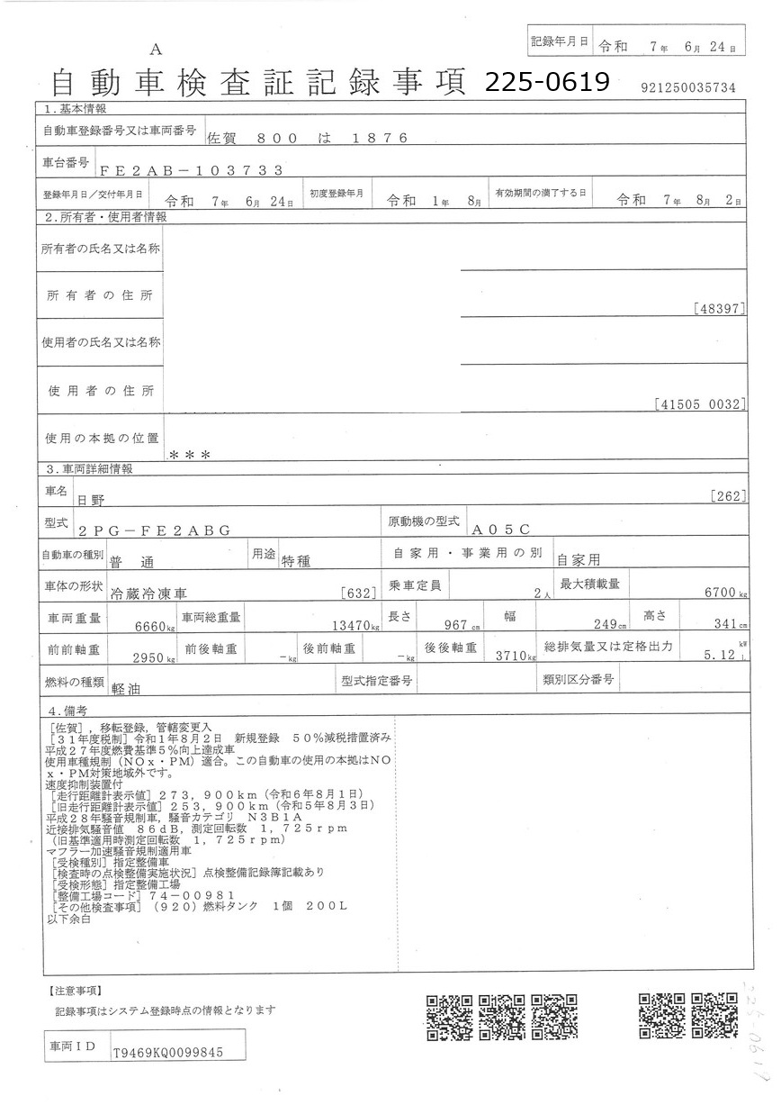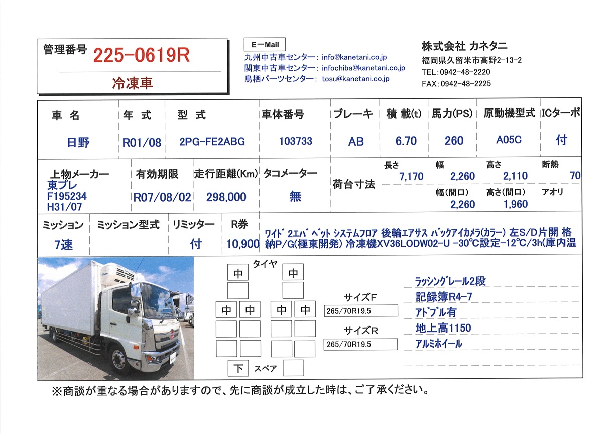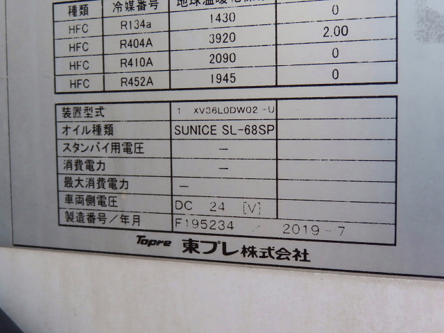 備考 | ワイド 2エバ ベッド システムフロア 後輪エアサス バックアイカメラ(カラー) 左S/D片開 格納P/G(極東開発) 冷凍機XV36LODW02-U -30℃設定-12℃/3h(庫内温度20℃) ETC2.0 |