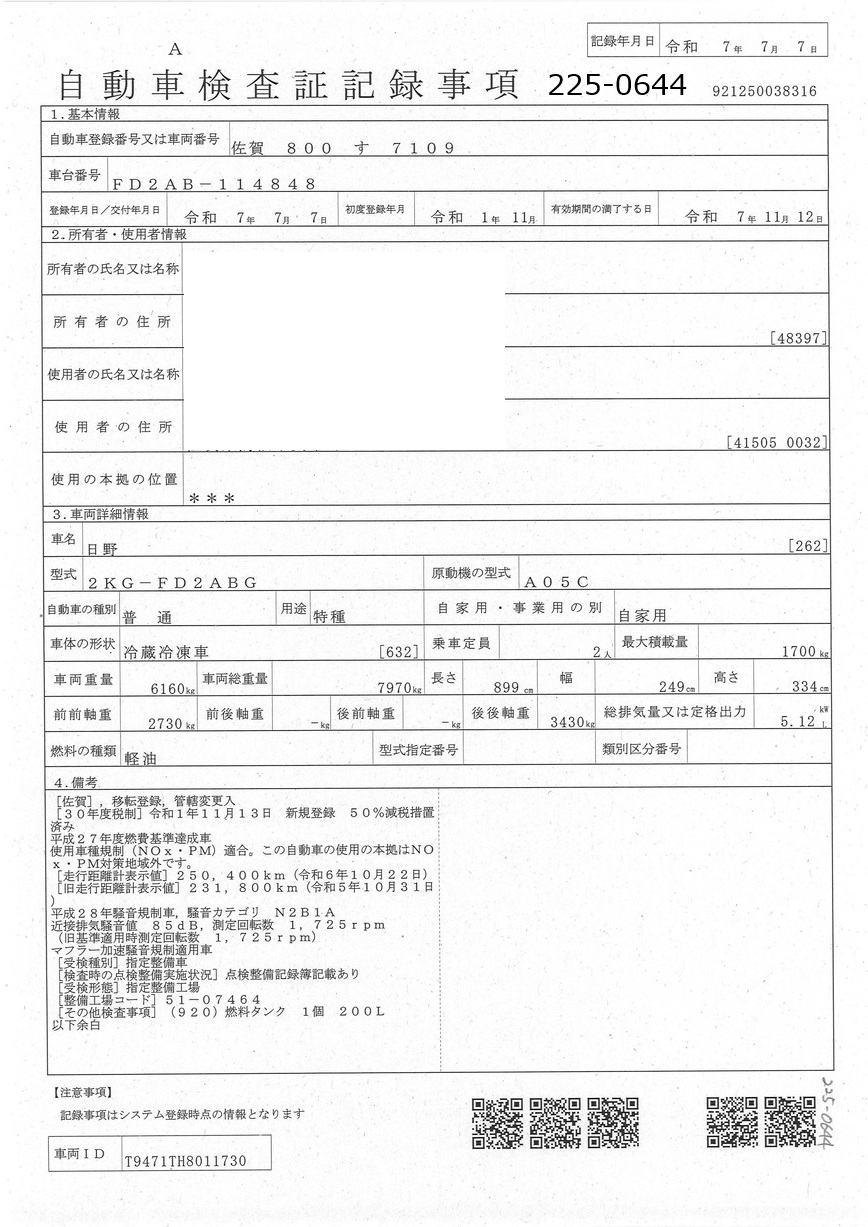 | 車検期限 | R07/11/12 | 走行距離 | 272,500Km |