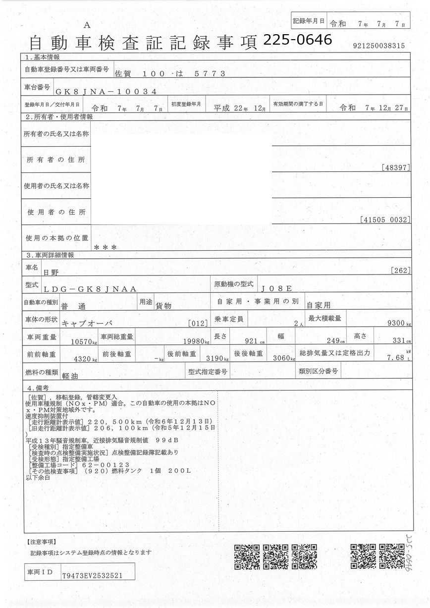 | 車検期限 | R07/12/27 | 走行距離 | 224,500Km |