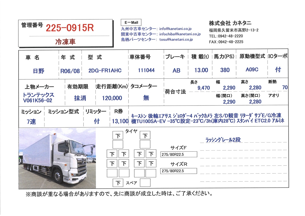 | 備考 | キーストン 後輪エアサス ジョロダー4 バックカメラ 左S/D観音 リターダ サブE/G TU100SC-CNC -35℃設定-23℃/3h(庫内28℃) スタンバイ メインキー1 スペアキー1 |