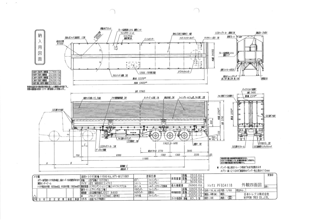 | 備考 | 未登録 3軸 リフトアクスル(前軸後軸リフト) 積載26.9t 融雪仕様 第5輪11.5t要 木床 アオリ7方開 ウィング電源(48㎜) センターポール付 |
