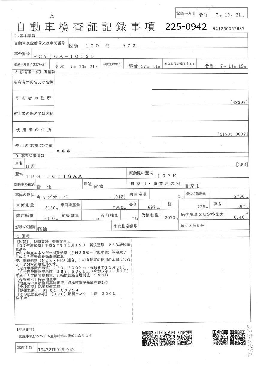 | 車検期限 | R07/11/12 | 走行距離 | 273,500Km |