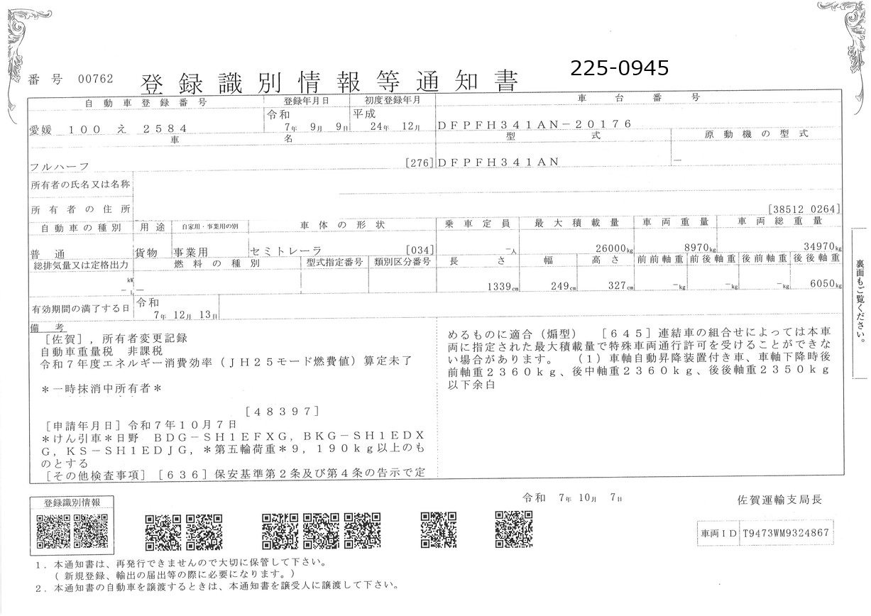 お問い合わせ番号:225-0945R| クラス(車両) | 大型 | メーカー | フルハーフ |