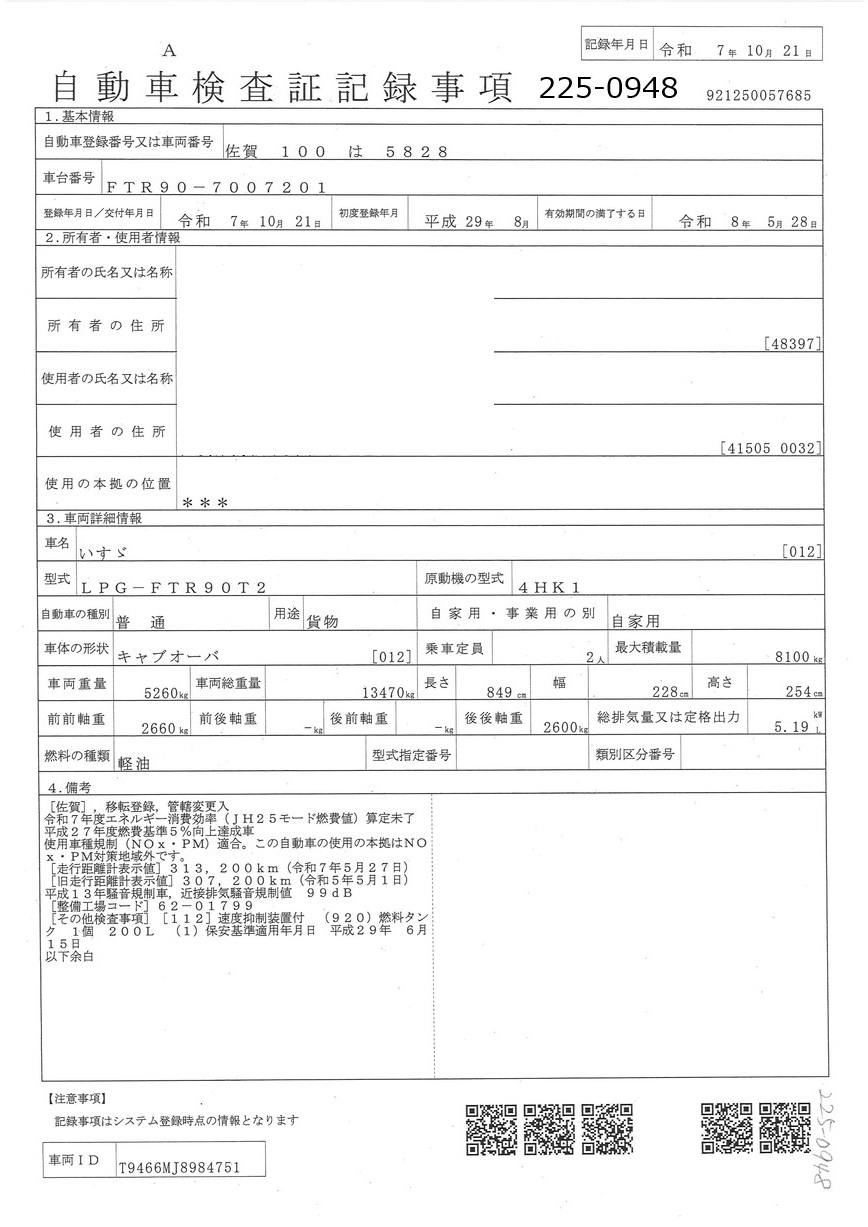 | 車両形式 | LPG-FTR90T2 | エンジン馬力 | 240PS |